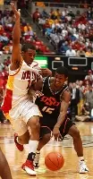 Then the Cowboys started beating the Cyclones to the basket for close-in shots. After Lucas hit a long 3-pointer to tie the score at 16, Oklahoma State got inside for its next nine baskets.