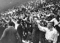 It almost raised the roof off the old building, noted Seldombridge, who left the campus in 1910. Exhilarated, the crowd surged to its feet and returned the rhythmic wave. It took two encores before the campus and community gathering was willing to relinquish the emotion of the moment.